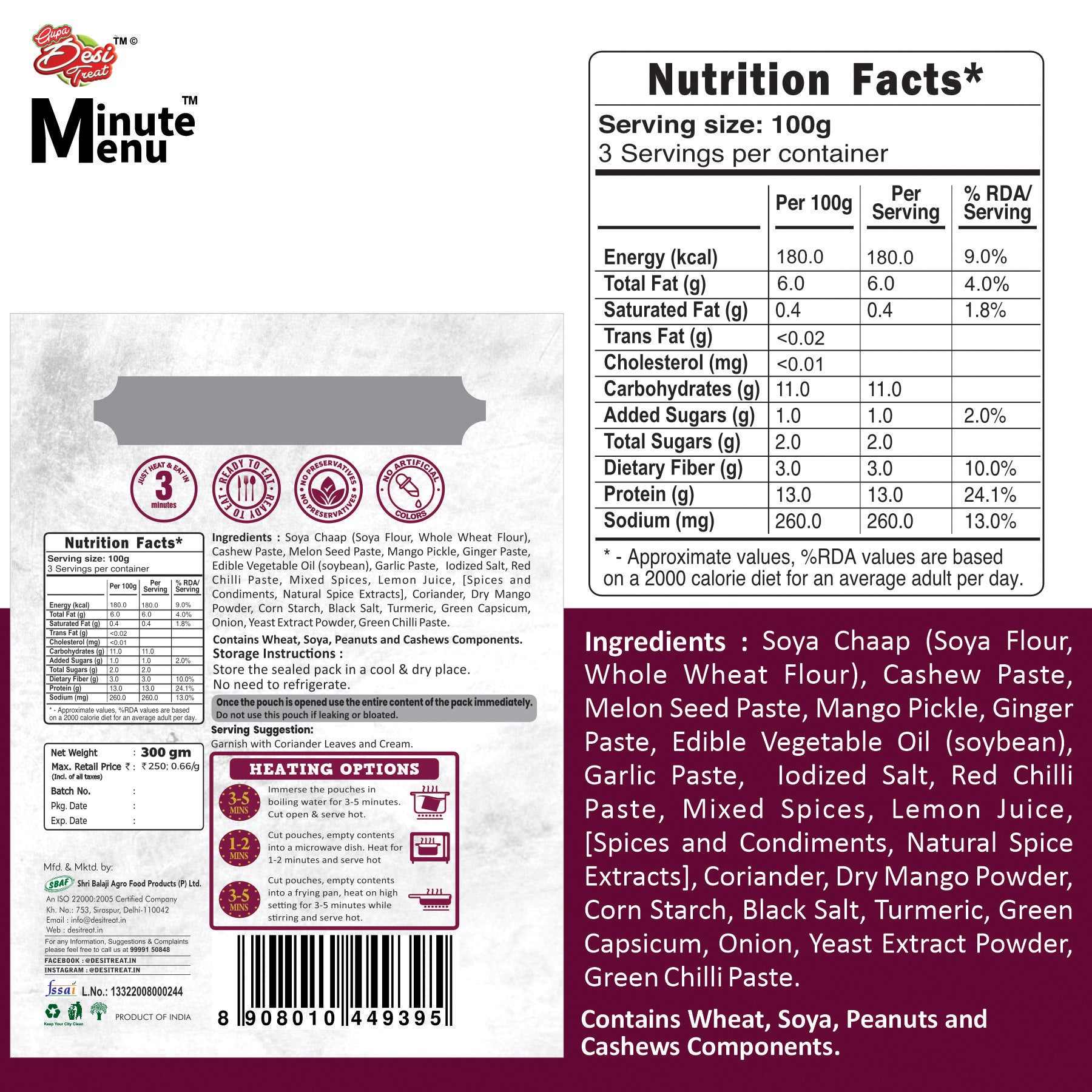 | Energy (Kcal) | 180 Kcal | 300 Grams | Ready To Eat | |