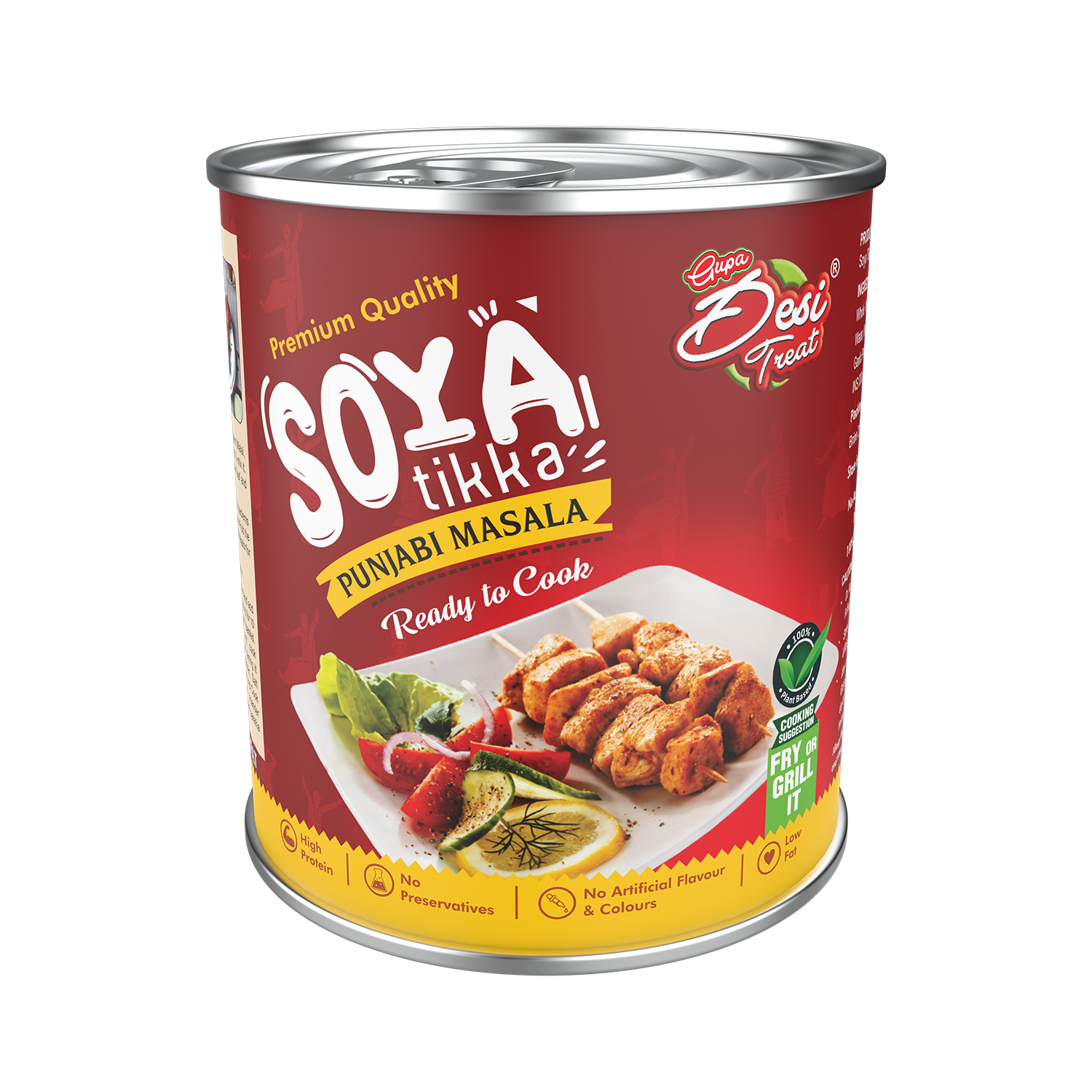 Desi Treat Punjabi Masala Soya Tikka: Enjoy the perfect blend of Punjabi spices and soy goodness. This ready-to-cook tikka is perfect for grilling or frying.